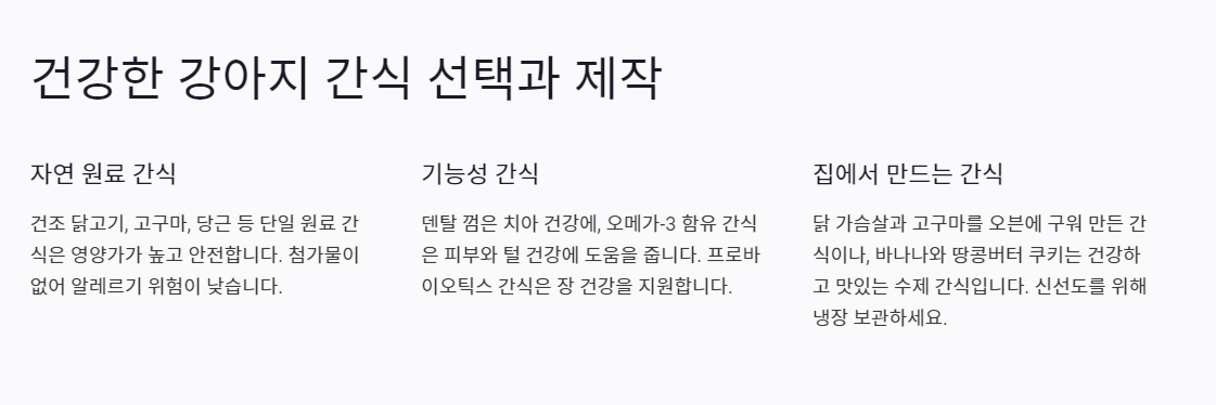 강아지의 나이, 체중, 건강 상태, 알레르기 여부에 따라 적합한 간식이 달라지므로 꼼꼼한 선택이 필요합니다. 또한 강아지 간식은 훈련 보상, 치아 건강 유지, 스트레스 완화 등 다양한 목적에 따라 사용될 수 있어 용도에 맞는 간식을 선택하는 것이 중요합니다.