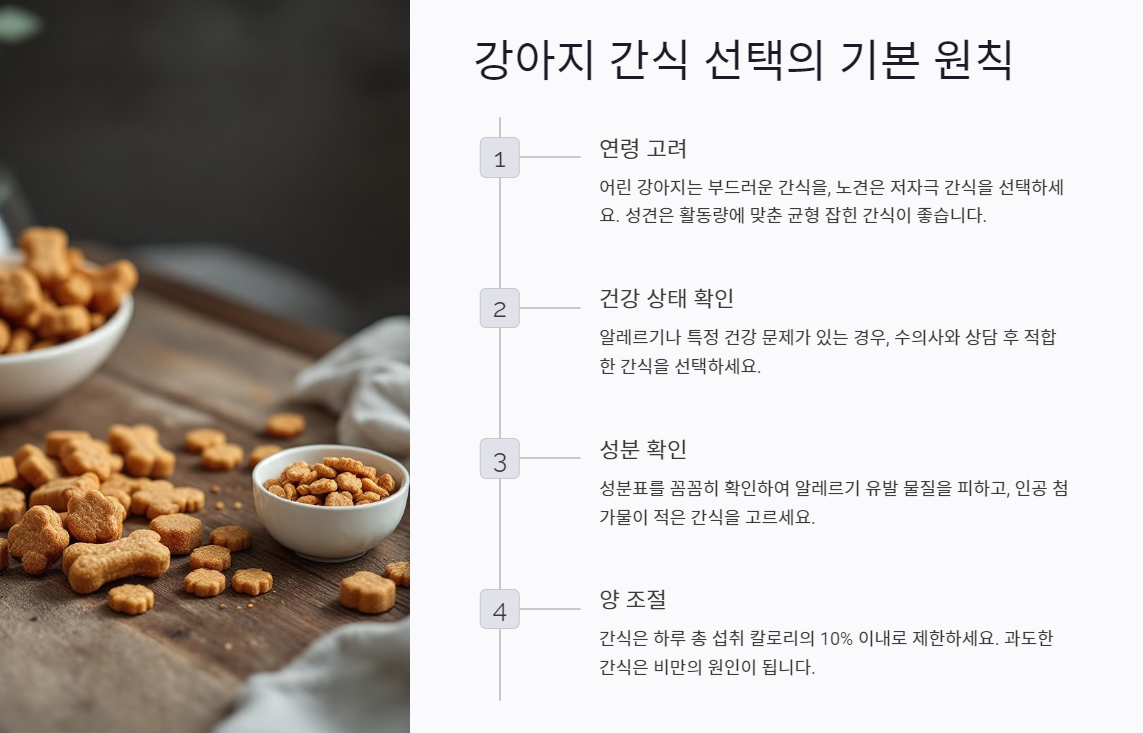 강아지 간식을 선택할 때는 다음과 같은 요소를 반드시 고려해야 합니다.