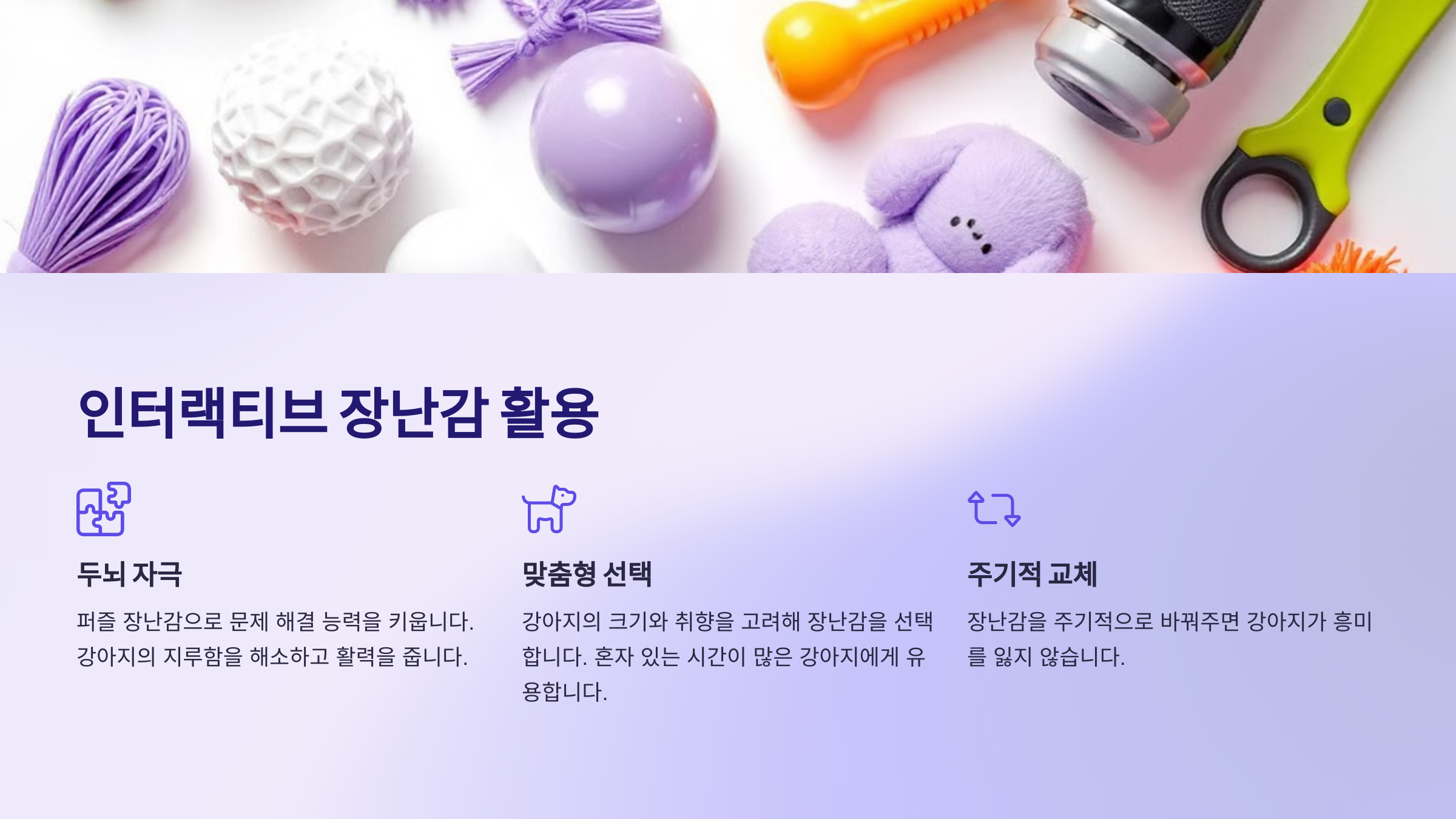 강아지의 크기와 취향에 맞는 인터랙티브 장난감이 가장 효과적입니다.