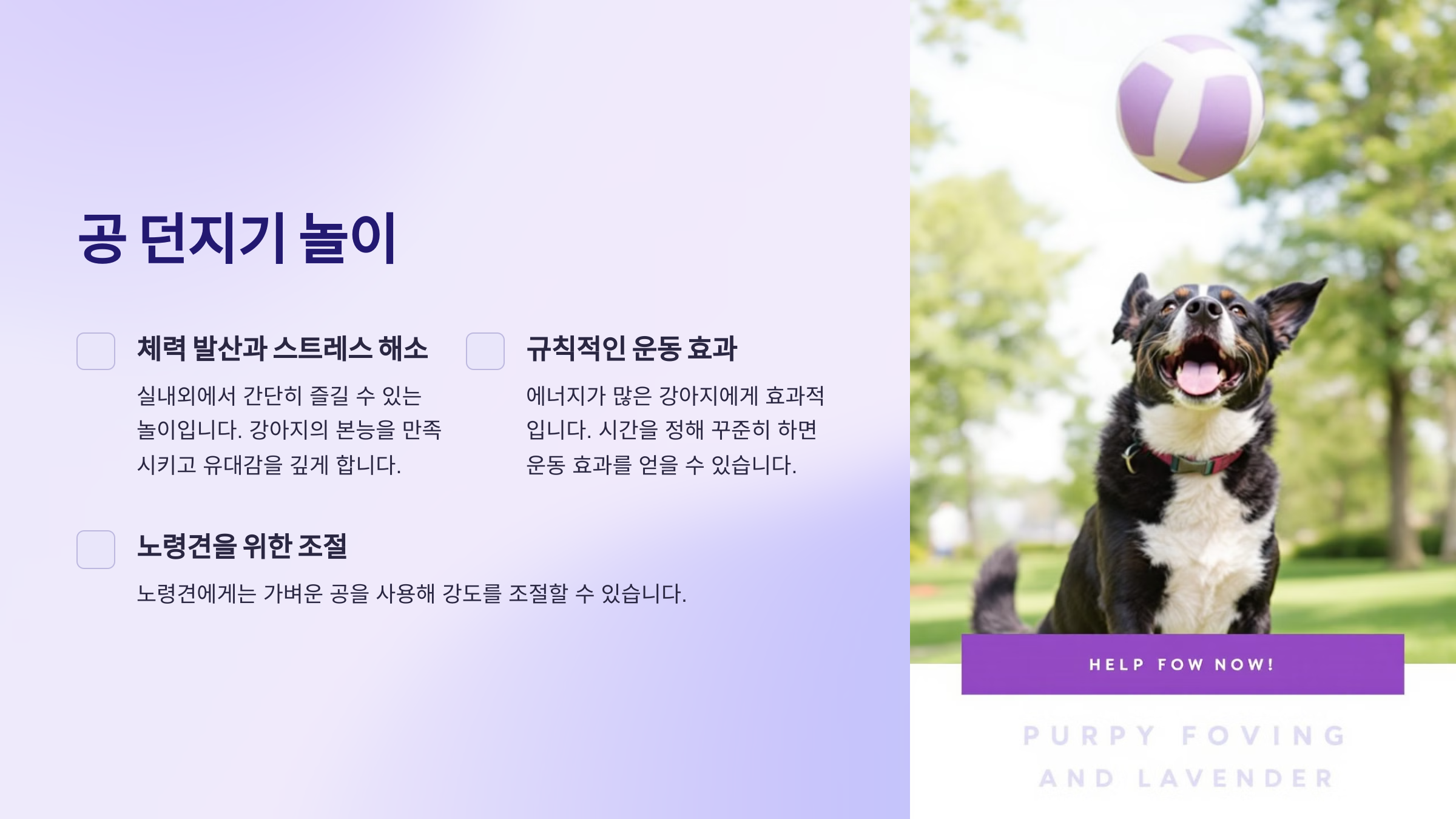공 던지기 놀이는 강아지가 체력을 발산하고 스트레스를 해소할 수 있는 좋은 방법입니다.