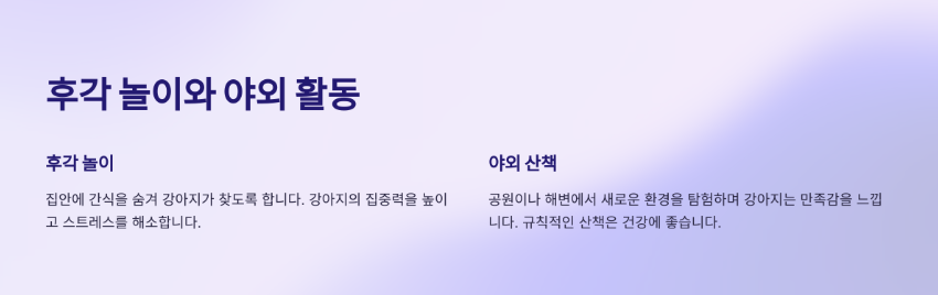 하루 30분~1시간의 활동 시간을 권장합니다. 강아지의 에너지 수준에 따라 조정하세요.