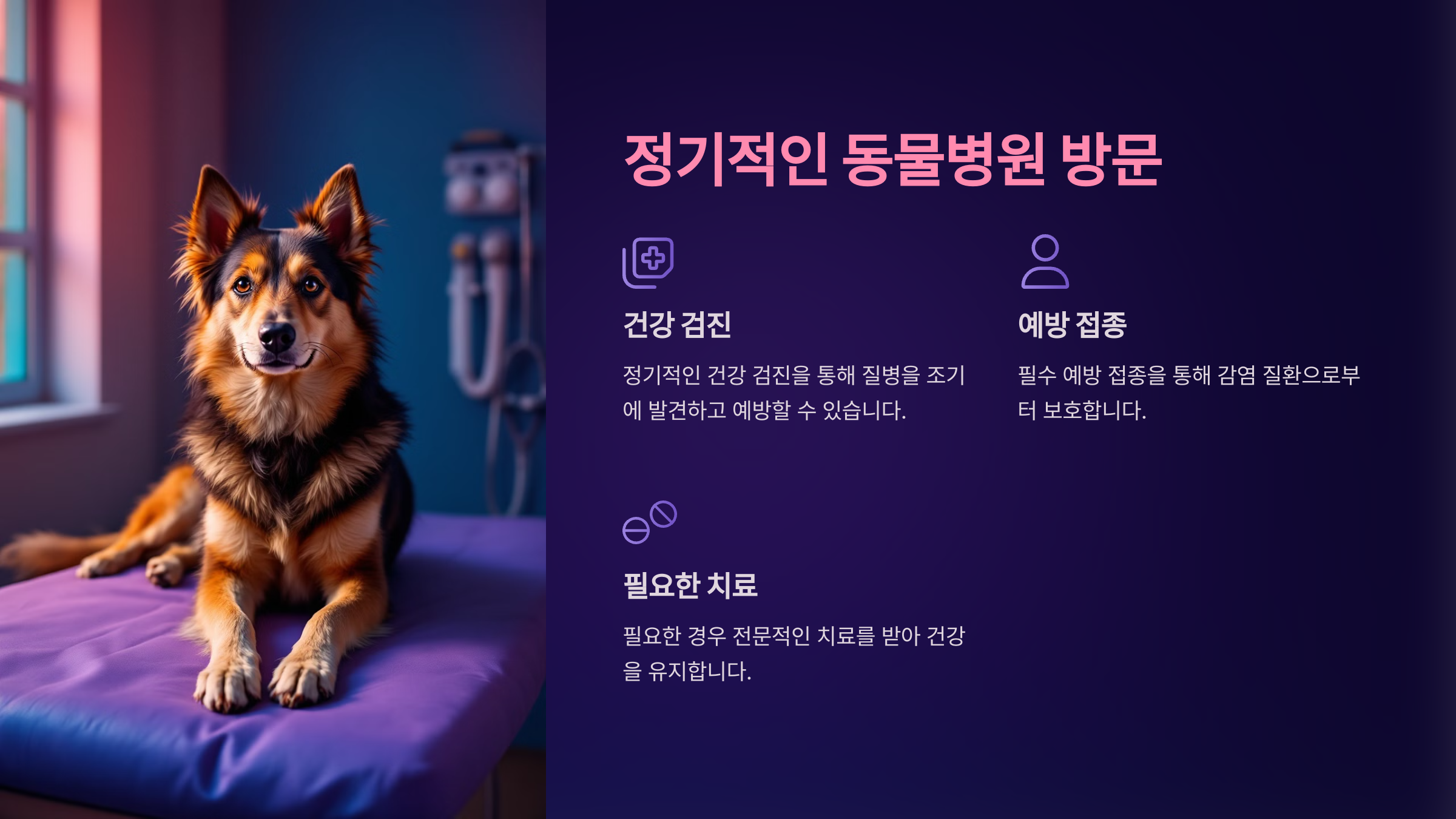 동물병원에서는 예방 접종, 기생충 예방, 치아 관리 등의 필수적인 건강 관리를 받을 수 있어요. 주기적으로 방문하면 질병의 조기 발견이 가능하므로, 치료에 소요되는 시간과 비용을 줄이는 데도 큰 도움이 돼요.