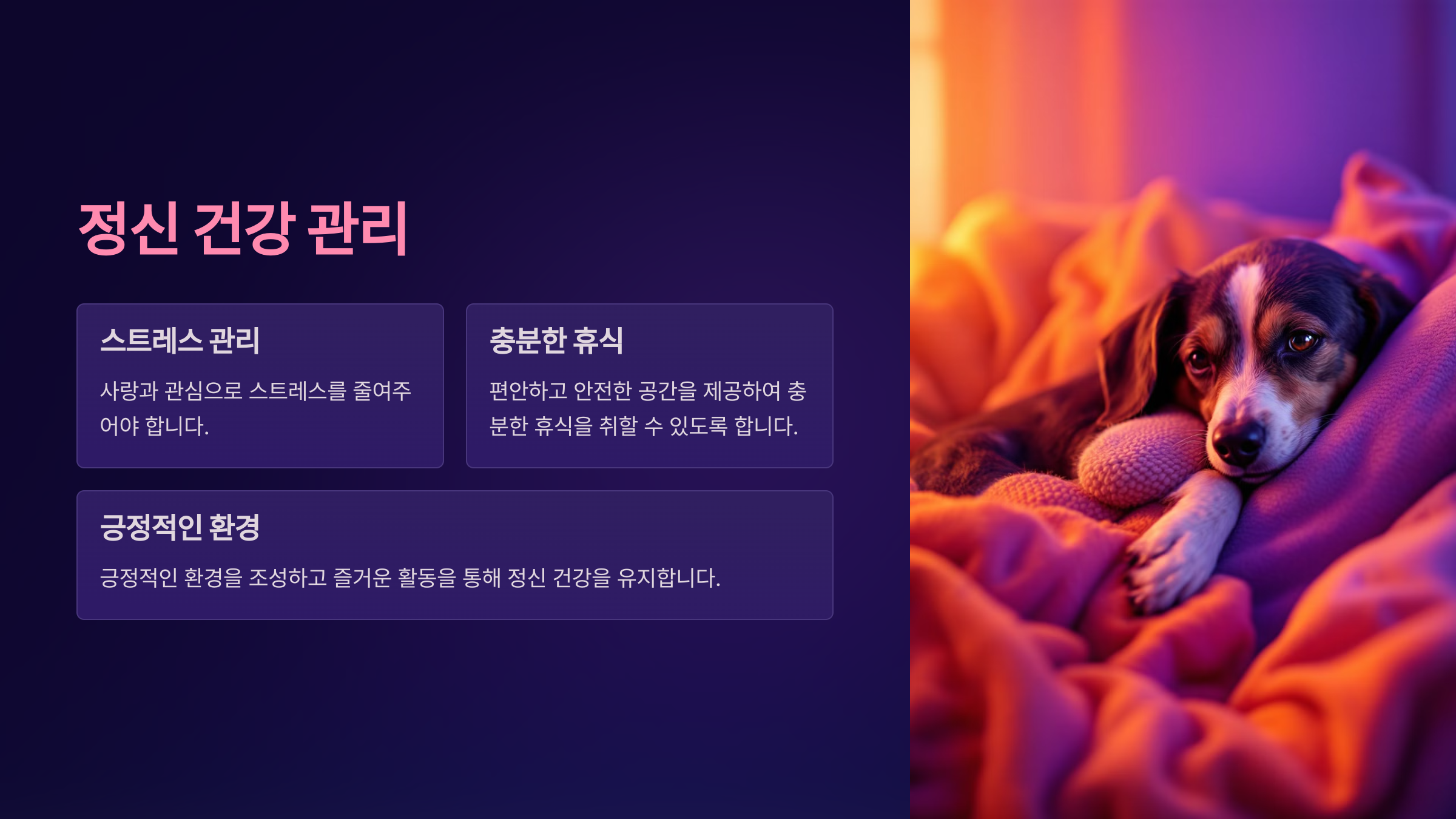 강아지의 정신 건강은 신체 건강만큼 중요해요. 강아지가 스트레스를 받거나 우울해지면, 이는 곧 신체적인 문제로도 이어질 수 있답니다. 따라서 강아지가 심리적으로 안정된 상태를 유지할 수 있도록 돕는 것이 중요해요