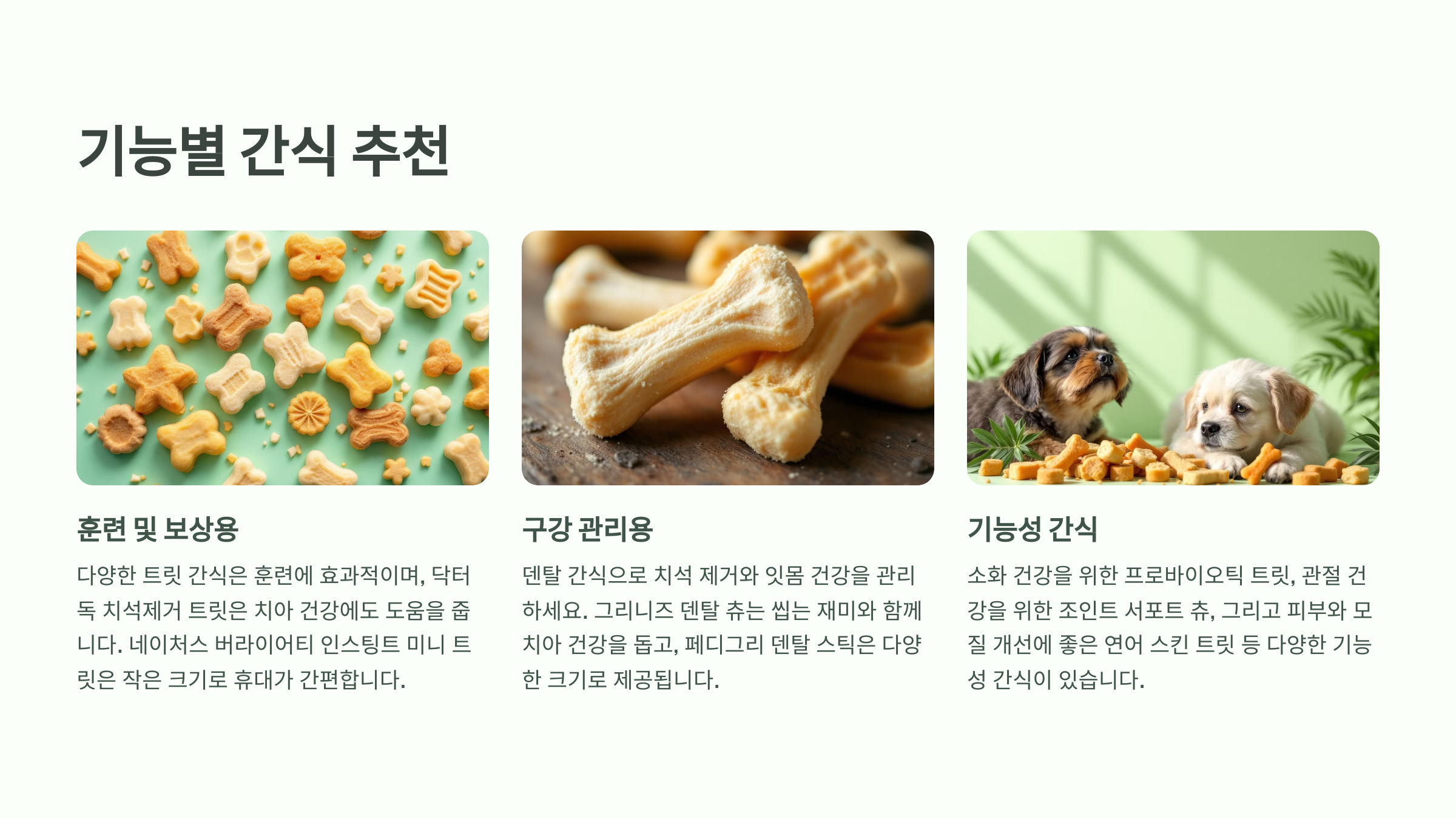 강아지 간식은 강아지의 건강 상태, 나이, 크기, 활동량, 그리고 알레르기 여부에 따라 적합한 제품을 선택하는 것이 중요합니다. 아래는 다양한 유형의 강아지 간식과 추천 제품 카테고리입니다.