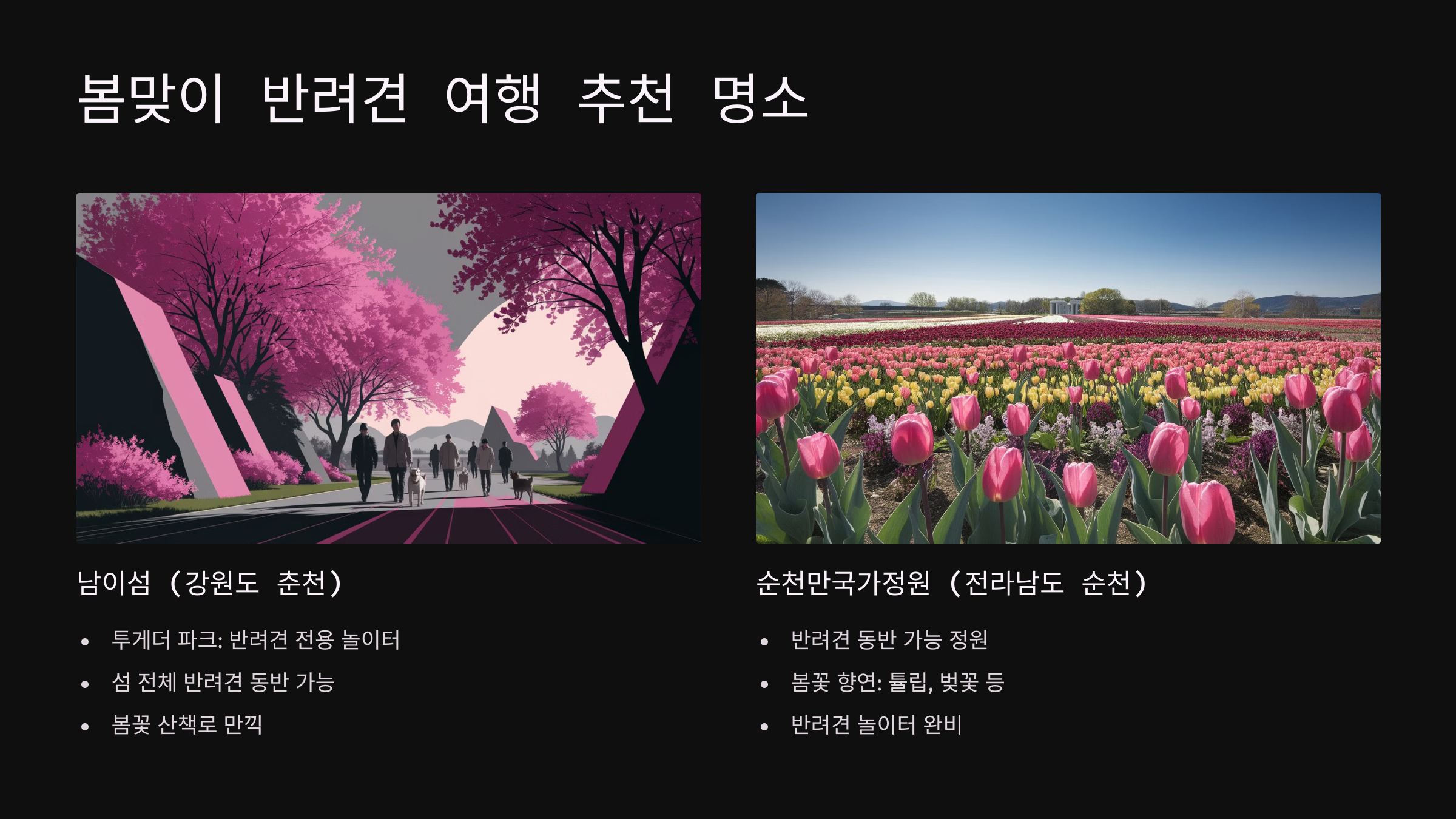 이외에도 전국에는 반려견과 함께 방문할 수 있는 아름다운 여행지가 많습니다. 여행을 계획할 때는 반려견의 컨디션을 고려하고, 동반이 가능한 숙소와 식당을 미리 예약하는 것이 중요합니다. 반려견과 함께하는 봄 여행을 더욱 즐겁게 만들기 위해 필요한 물품을 준비하고, 안전한 여행을 즐기세요!